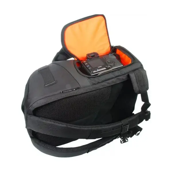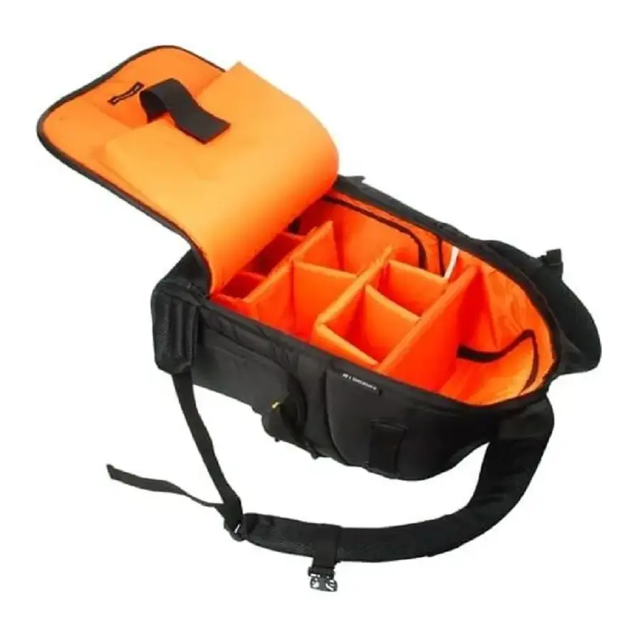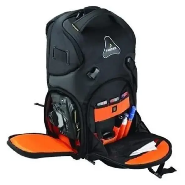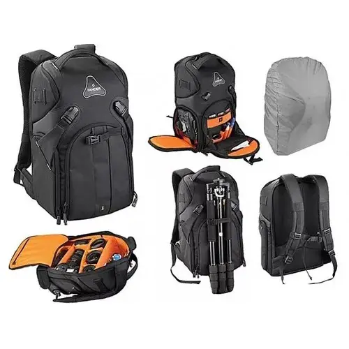 Essa mochila também possui um zíper secreto para equipamentos valiosos e formato com sistema personalizável, sendo resistente a água, poeira e areia, possui uma capa de chuva e porta tripés