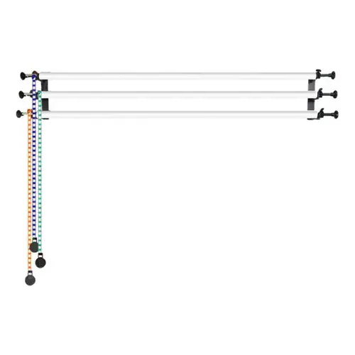 Capacidade: Apoio até 3 fundos simultaneamente. Compatibilidade: Fundos de papel, tecido ou vinil. Fixação: Pode ser instalado Mecanismo: Roldanas e correntes para ajuste de altura. Material: Estrutura em metal resistente. Dimensões: Adaptável a diversos tamanhos de fundo.